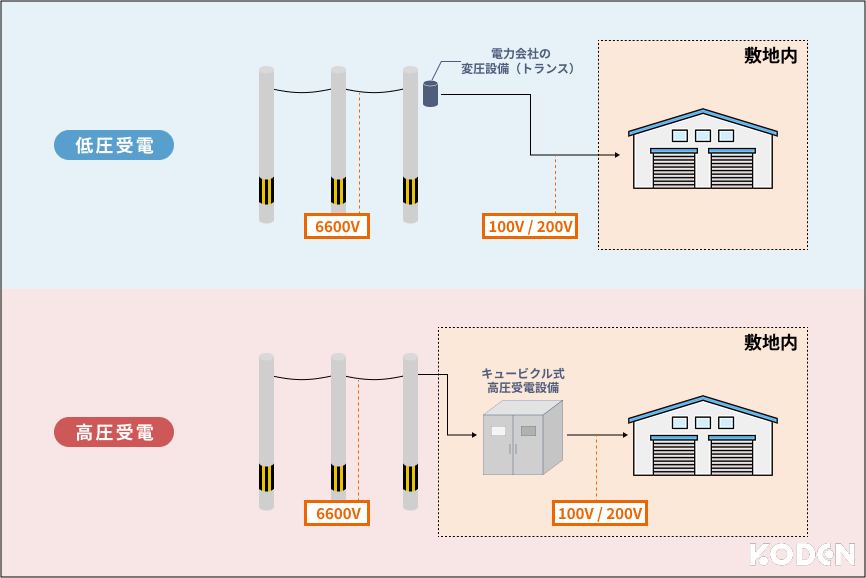 一般家庭や事務所、小規模店舗では、電力会社または施設所有者が設置した変圧器で降圧された低圧電力(100V/200V)を受電契約します。一方、電力を多く使用する工場やビルでは、高圧受電(6,600V)契約を結び、自社の管理下でキュービクルを使って降圧します。