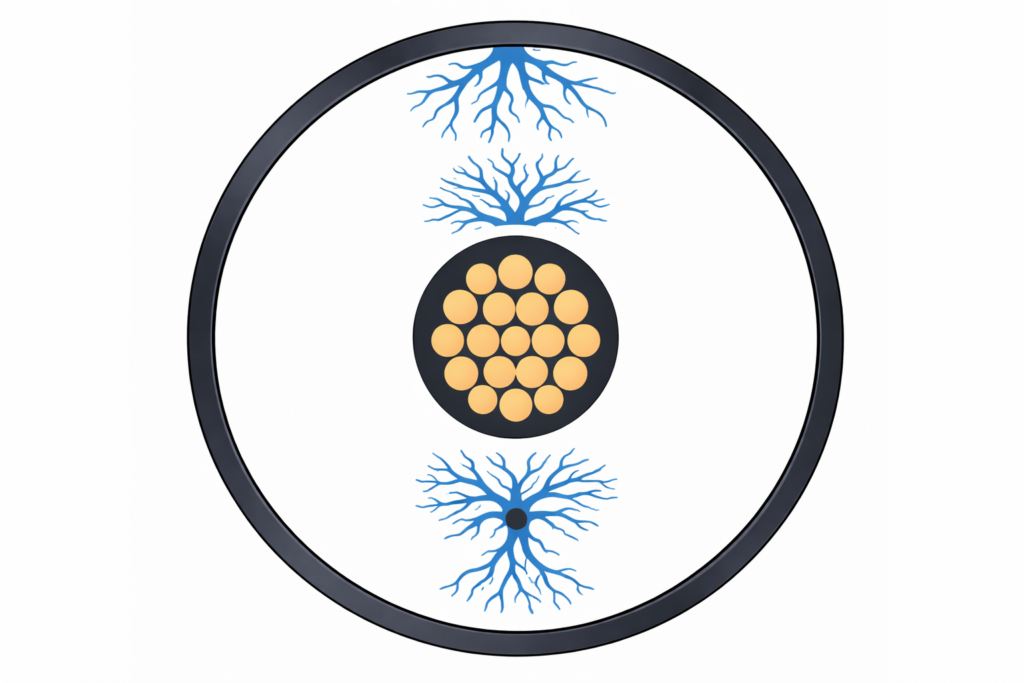 高圧ケーブルは、電気を流す導体・その周囲を覆う絶縁体・電界を整える遮へい層・外部から保護するシースなど、複数の層で構成されています。劣化は主に絶縁体や遮へい層、端末部で発生します。
