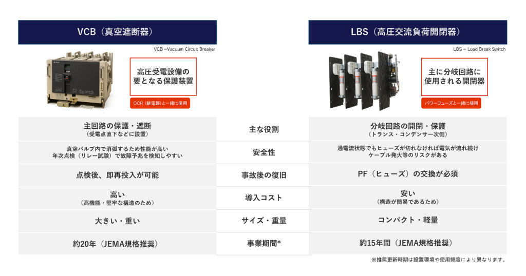 LBSはヒューズによる「受動的」な保護しかできませんが、VCBは事故のリスクが高い環境でも、安全かつ確実に回路を遮断・復旧できる能力が高いためです。