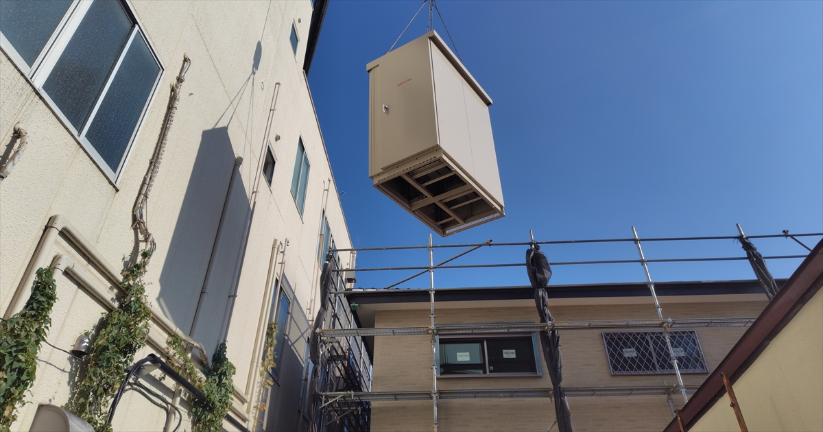 新しい高圧コンデンサを現場に搬入し、指定位置に据付します。
