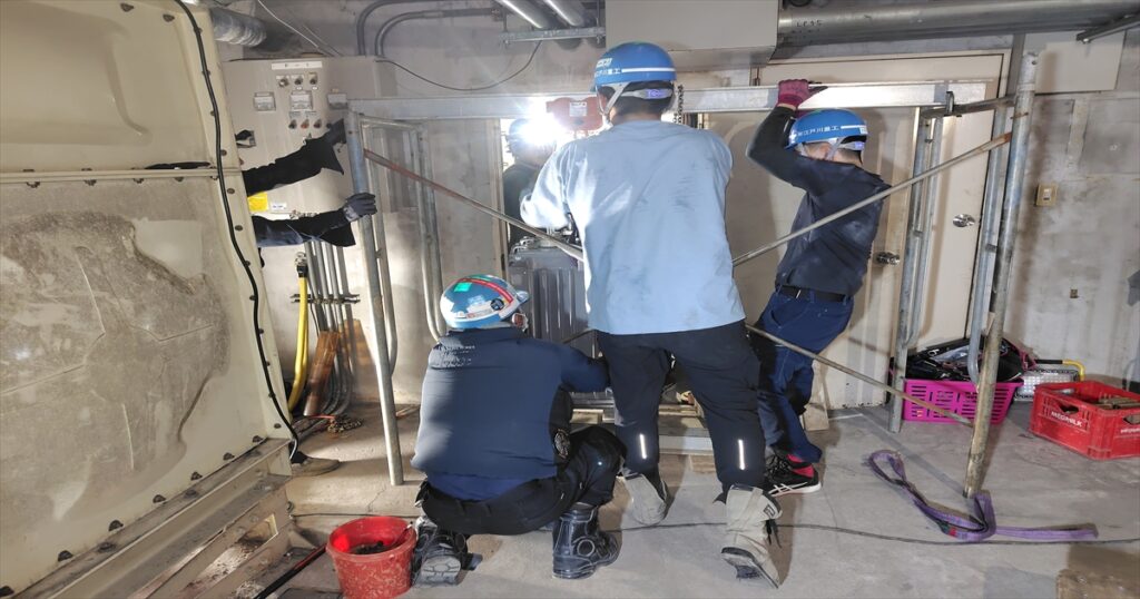 重量鳶(重量物運搬・据え付けの専門職)にトランスの移動は依頼。細かく足場を作り、トランスを吊り上げる門型リフターなどの設備を設置しながら少しずつ確実に搬出・搬入を行いました。